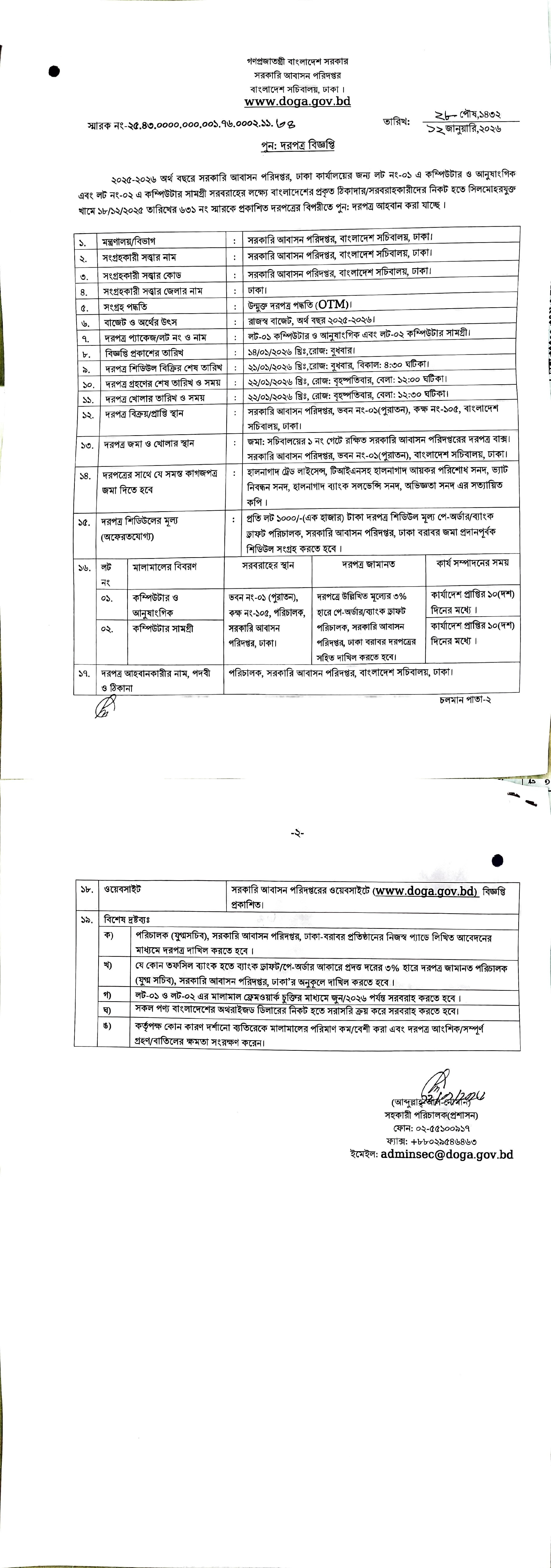 ২০২৫-২০২৬ অর্থ বছরে সরকারি আবাসন পরিদপ্তর, ঢাকা কার্যালয়ের জন্য কম্পিউটার ও আনুষাংগিক সরবরাহের লক্ষ্যে পুন: দরপত্র আহবান। (১৮-১২-২০২৫)